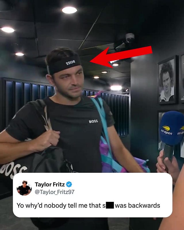 Taylor Fritz walked onto Arthur Ashe Stadium for his US Open quarterfinal against Novak Djokovic wearing his BOSS headband upside down. He completed the tunnel walk, pre-match interview, coin toss, net photos, and three sets of play, before anyone told him.